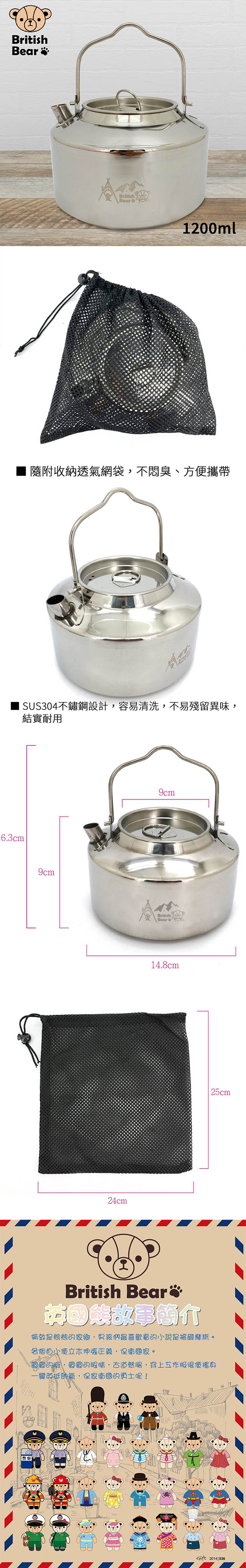 英國熊 304不鏽鋼露營茶壺1.2L(附收納袋) H-A031 ■ 英國熊授權圖案商品 ■ SUS304不鏽鋼設計,容易清洗,不易殘留異味,結實耐用 ■ 可直接在柴火上燒煮,壺體無塑料材質,體驗野炊樂趣 ■ 隨附收納透氣網袋,不悶臭、方便攜帶 ■ 1.2公升容量設計 戶外露營、野餐使用方便