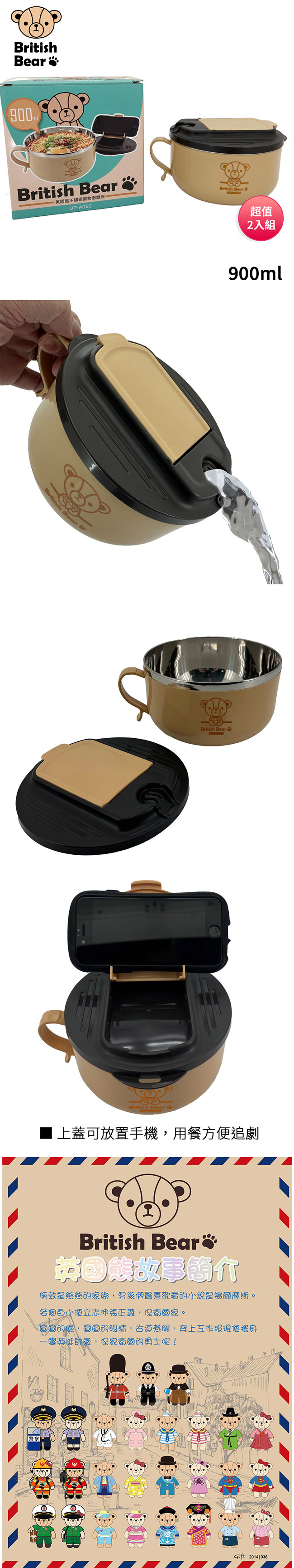 英國熊 304不鏽鋼內膽置物泡麵碗900ml UP-A060 超值2入組 ■ 英國熊授權圖案商品 ■ 內膽SUS304不鏽鋼安全耐用 ■ 上蓋可放置手機,用餐方便追劇 ■ 雙層設計,隔熱防燙 ■ 一杯多用,可充當簡易濾水工具、泡麵碗、盛湯、飯菜碗