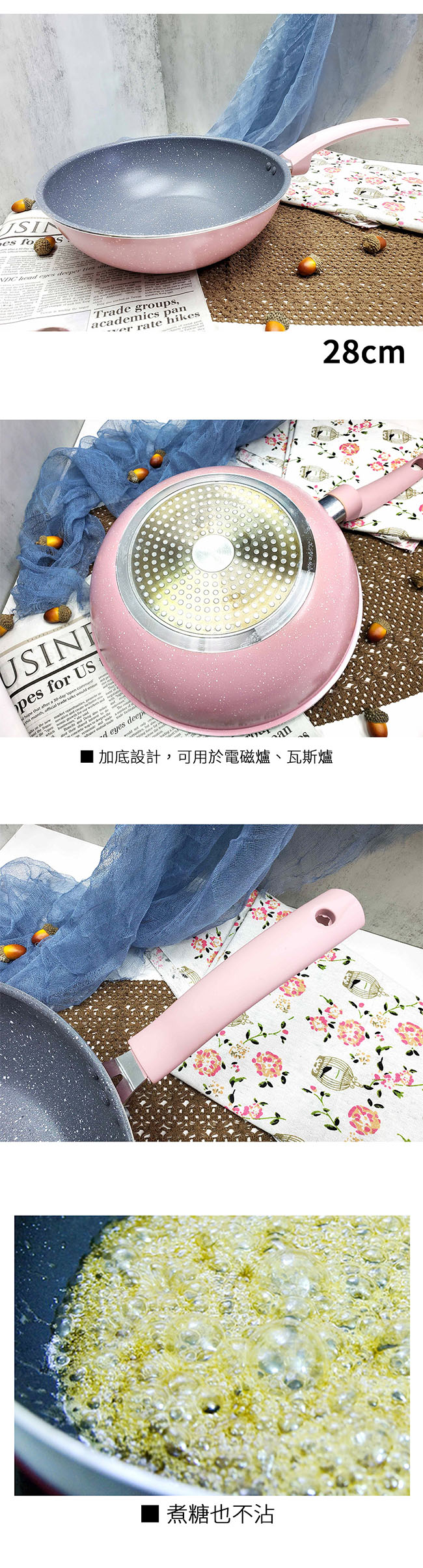 三箭牌 大理石不沾28CM深型炒鍋(加底) MIY-128 ■ 鍋體採用厚板鋁合金,導熱性能快速 ■ 表面不沾塗層清洗容易 ■ 加底設計,可用於電磁爐、瓦斯爐 ■ 使用瓦斯爐加熱時,火焰不可超出鍋底導熱金屬片(請轉小火),以免燒到把手 ※清潔與保養 1.使用後請用海綿或軟性菜瓜布清洗。 2.清除焦物勿用尖銳器,可先浸泡熱水待軟化後再清洗。 3.清洗後以乾布擦乾或烘乾,避免水漬產生烙痕。 ※注意事項 1.使用前請用清水洗淨即可。 2.清洗鍋具請用泡棉或軟性菜瓜布。 3.請勿空燒,以免變形破壞結構,勿用尖物敲擊。 4.鹽分或酸性食物勿置於鍋內太久,請以其他容器盛裝保存。 5.電磁爐及瓦斯爐兩用。 6.用於瓦斯爐時,火焰勿超過鍋底導熱金屬片。