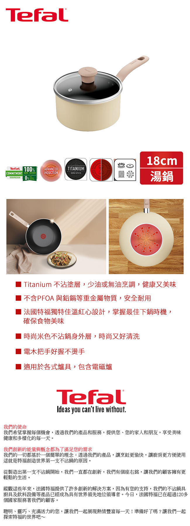 法國特福 Daisy系列18CM不沾單柄湯鍋加蓋 H0492324 ■ Titanium 不沾塗層,少油或無油烹調,健康又美味 ■ 不含PFOA 與鉛鎘等重金屬物質,安全耐用 ■ 法國特福獨特佳溫紅心設計,掌握最佳下鍋時機,確保食物美味 ■ 時尚米色不沾鍋身外層,時尚又好清洗 ■ 電木把手好握不燙手 ■ 適用於各式爐具,包含電磁爐
