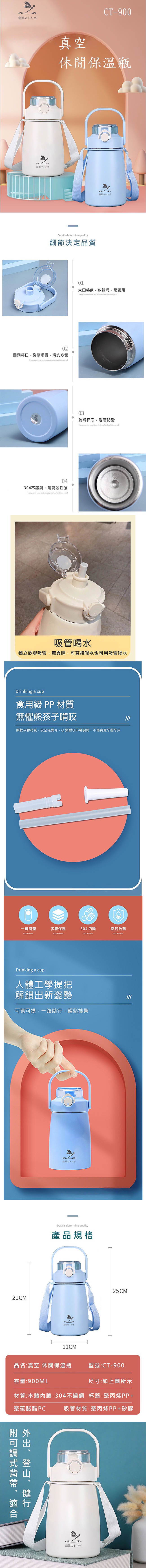玉蜻蜓 304不鏽鋼內膽真空休閒吸管保溫瓶900ml(顏色隨機出貨) CT-900 無論是在工作、休閒還是旅行中,玉蜻蜓 真空 休閒保溫瓶都是您不可或缺的良伴,為您的生活增添一份精彩與便利。選擇玉蜻蜓,讓每一刻都充滿愉悅與美好。 ■ 高真空保溫: 採用先進的真空技術,有效減少熱量流失,保溫效果持久。不論是熱茶還是冰水,都能在您需要時保持理想溫度,帶給您極致享受。 ■ 特殊漆面: 經特殊處理的漆面,不僅能抵抗指紋和刮擦,更展現出時尚與耐用的特性。無論在辦公室、戶外活動或旅行途中,都能保持外觀清新如新。 ■ 多功能設計(附提把+可調式背帶): 附有提把和可調式背帶,讓您可以輕鬆攜帶,無論是手提還是背負都得心應手。隨著您的節奏,隨時隨地享受您喜愛的飲品。 ■ 一鍵開蓋: 簡單按下按鈕,即可輕鬆開啟瓶蓋,操作簡便。不再為繁瑣的開蓋過程而煩惱,讓您輕鬆享受喝水的樂趣。 ■ 獨立矽膠吸管: 配置獨立的矽膠吸管,無異味,安全可靠。無論是直飲還是使用吸管,都能讓您品嚐到飲品的原汁原味,滿足您不同的喝水需求。