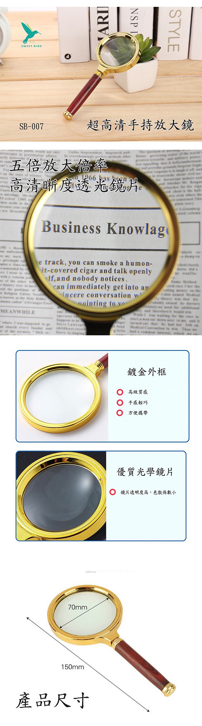 SWEET BIRD蜂鳥 超高清手持放大鏡 SB-007 無論是日常生活中的觀察、學術研究還是探索自然奧秘,蜂鳥 超高清手持放大鏡都是您不可或缺的良伴。讓我們攜手探索微小世界的奧妙,開啟一場屬於您的探索之旅! ■ 光學鏡片:我們採用的光學鏡片具有卓越的透明度和色散係數,確保您觀察到的影像清晰、真實,不受色彩失真的影響。 ■ 鍍金外框:每一款蜂鳥放大鏡都採用精緻的鍍金外框,展現出高級質感,不僅提升了產品的美觀,更增添了持久耐用的特性。 ■ 木質手柄:我們特別選用輕巧的木質材料打造手柄,讓握持更加舒適,讓您可以長時間持續使用而不感到疲勞。 ■ 五倍放大:蜂鳥超高清手持放大鏡提供五倍放大功能,讓您可以更深入地觀察微小細節,發現事物中更多的驚奇與趣味。 ■ 小巧輕便:我們設計了輕巧便攜的外形,讓您可以輕鬆將放大鏡放入口袋或包包中,隨身攜帶,隨時隨地探索您感興趣的事物。
