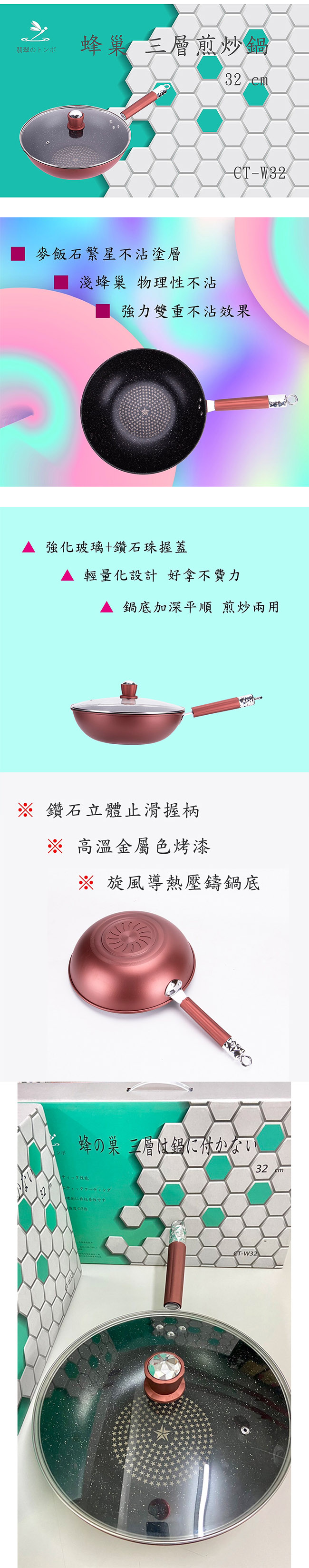 玉蜻蜓 蜂巢麥飯石不沾塗層三層煎炒鍋32cm(附蓋) CT-W32 在繁忙的現代生活中,一個高效、方便的廚房工具能夠為您的烹飪體驗增添樂趣,而玉蜻蜓 蜂巢 三層煎炒鍋就是這樣一個完美的選擇。這款創新的煎炒鍋將會改變您的烹飪方式,讓您輕鬆應對各種料理挑戰。 ■ 雙重不沾效果 採用蜂巢物理性不沾和麥飯石繁星不沾塗層,提供強力雙重不沾效果,讓您無需擔心食物粘在鍋底上,輕鬆清洗,輕鬆烹飪。 ■ 輕量化設計 設計為輕量化,讓您輕鬆拿取,毫不費力地處理各種烹飪工作。無論您是煎炒、炒菜還是燉煮,這個鍋子都是您的完美選擇。 ■ 煎炒兩用 鍋底加深平順,使得它不僅適用於煎炒,還能夠完美地應對各種烹飪需求,煮湯、燉肉,應有盡有,一鍋多用,輕鬆應對。 ■ 鑽石立體止滑握柄 配備鑽石立體止滑握柄,舒適牢固,不易滑落,讓您在烹飪過程中更加安心,操作更加順暢。 ■ 旋風導熱壓鑄鍋底 鍋底採用旋風導熱壓鑄技術,快速均勻地將熱量傳遞給食物,節省您寶貴的烹飪時間,讓您的料理更加美味。