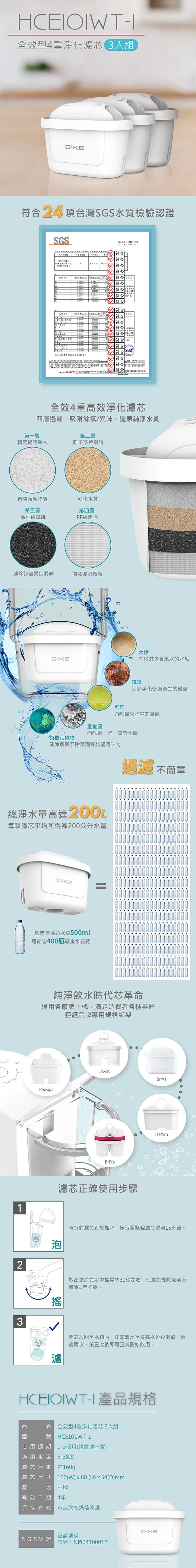 主商品:濾芯x3 使用週期:1-3個月(視當地水質) 適用水溫:5-38度 濾芯淨重:約160g 濾芯尺寸:100(W)x80(H)x54(D)mm 有效日期:4年 保存方式:存放於乾燥陰涼處 SGS認證:認證通過證號 NPI24100012 產地:中國 以上規格±5% ※依照消費者保護法的規定,享有猶豫期的權益。 ※猶豫期並非試用期,所以,您所退回的商品必須是全新的狀態、而且完整包裝。 ※請注意保持商品本體、配件、贈品、保證書、原廠包裝及所有附隨文件或資料的完整性,切勿缺漏任何配件或毀損原廠外盒。 ※若有遺失或汙損,將會視情況酌收相關費用。
