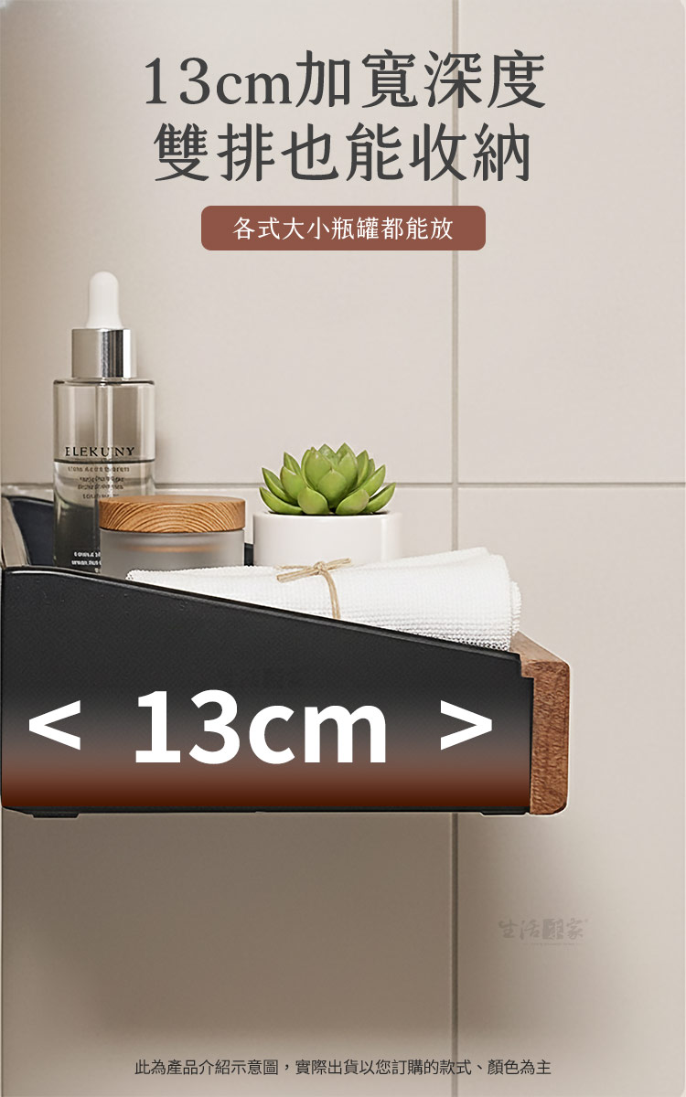 👉 人性化設計,空間效益最大化 📐 ․13cm加寬深度:讓大瓶小罐可以輕鬆雙排收納,不再擠成一團。 ․加高擋邊:有效防止拿取或放置物品時碰撞滑落,特別適合高瓶身的沐浴乳或洗髮精。 ․組合式收納 :多個安裝層距可自由調節,高矮瓶罐隨心所欲擺放,完美利用垂直空間。