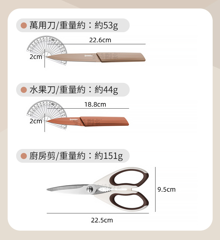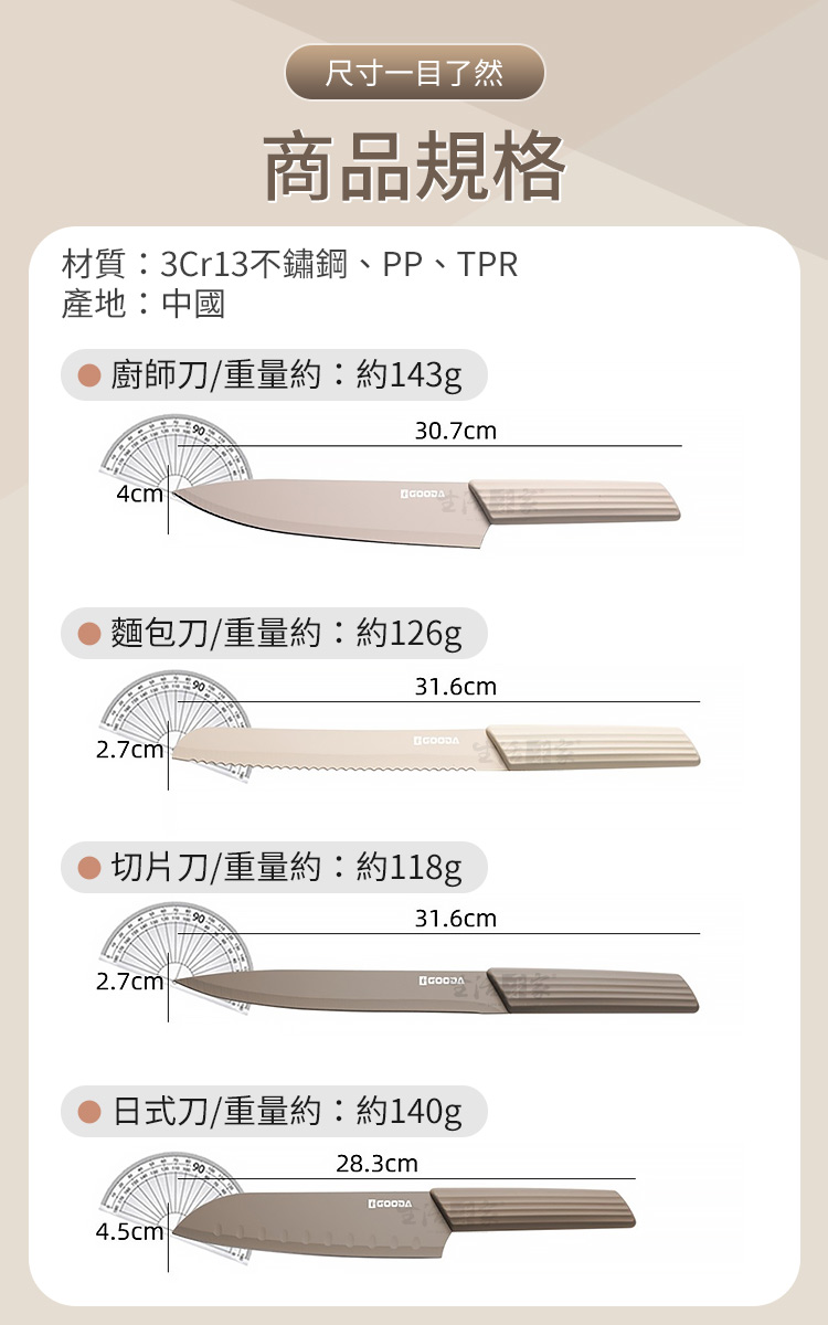 1.尺寸: 廚師刀-30.7cm、麵包刀-31.6cm、切片刀-31.6cm、日式刀-28.3cm、萬用刀-22.6cm、水果刀-18.8cm、廚房剪-22.5cm 2.材質:刀刃-3Cr13不鏽鋼、刀柄-PP、TPR 3.重量:廚師刀-約143g、麵包刀-約126g、切片刀-約118g、日式刀-約140g、萬用刀-約53g、水果刀-約44g、廚房剪-約151g 4.產地:中國 5.適用:肉類、海鮮、麵包、甜點、蔬果等切削使用