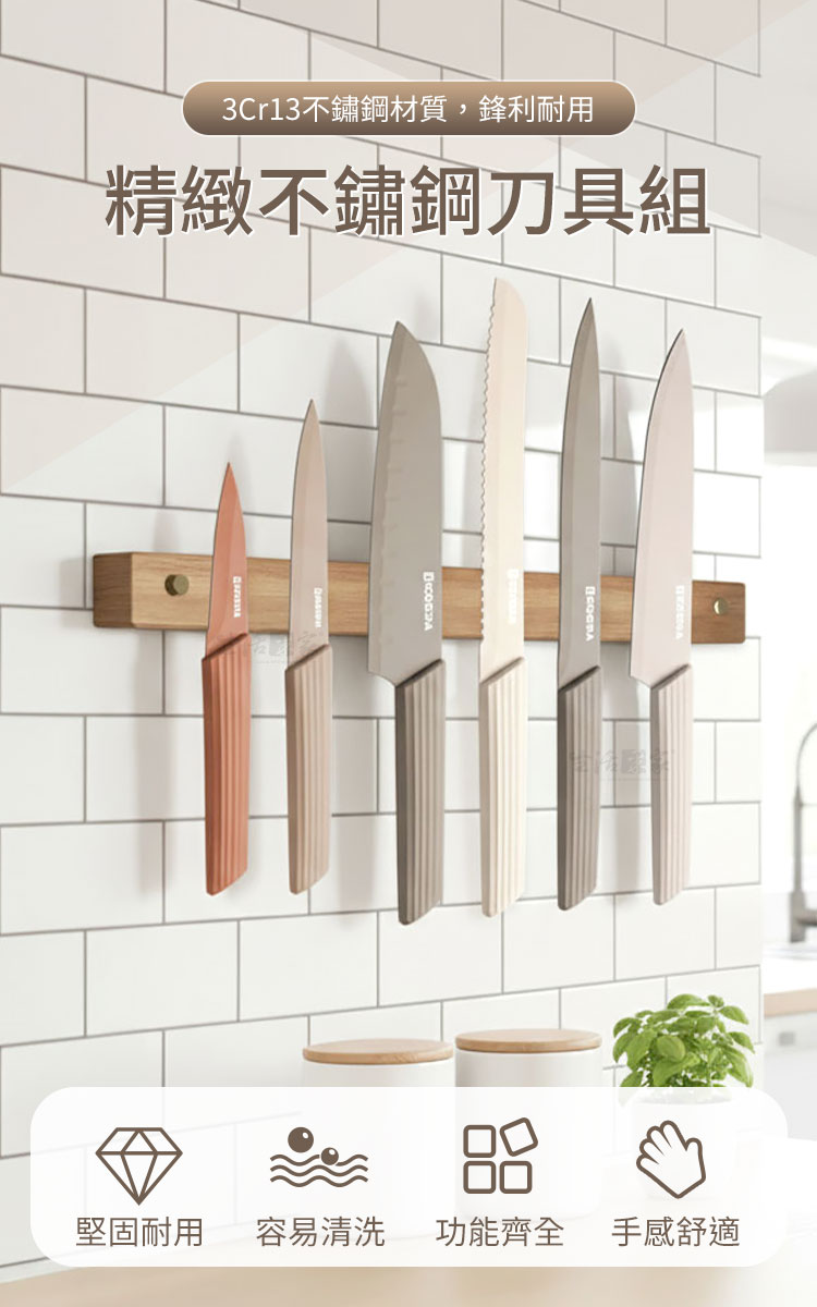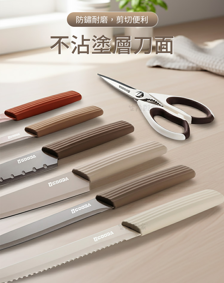 👉 專業配置,一組搞定所有料理任務 🍅 多功能刀型設計:廚師刀、切片刀、麵包刀、水果刀、日式刀、剪刀一應俱全。 🍞 防滑握柄:刀柄防滑紋理提升切削穩定度,即使手濕也好握不滑。 🍖 不鏽鋼刀面+不沾塗層:防鏽耐用、易清洗,切肉、切菜、切麵包都順手。 🌈 簡約時尚外型:中性色調搭配流線設計,完美融入各種廚房風格。 🧼 好清好收納:用後一沖即淨,乾淨不留異味,刀套保護安全又方便。