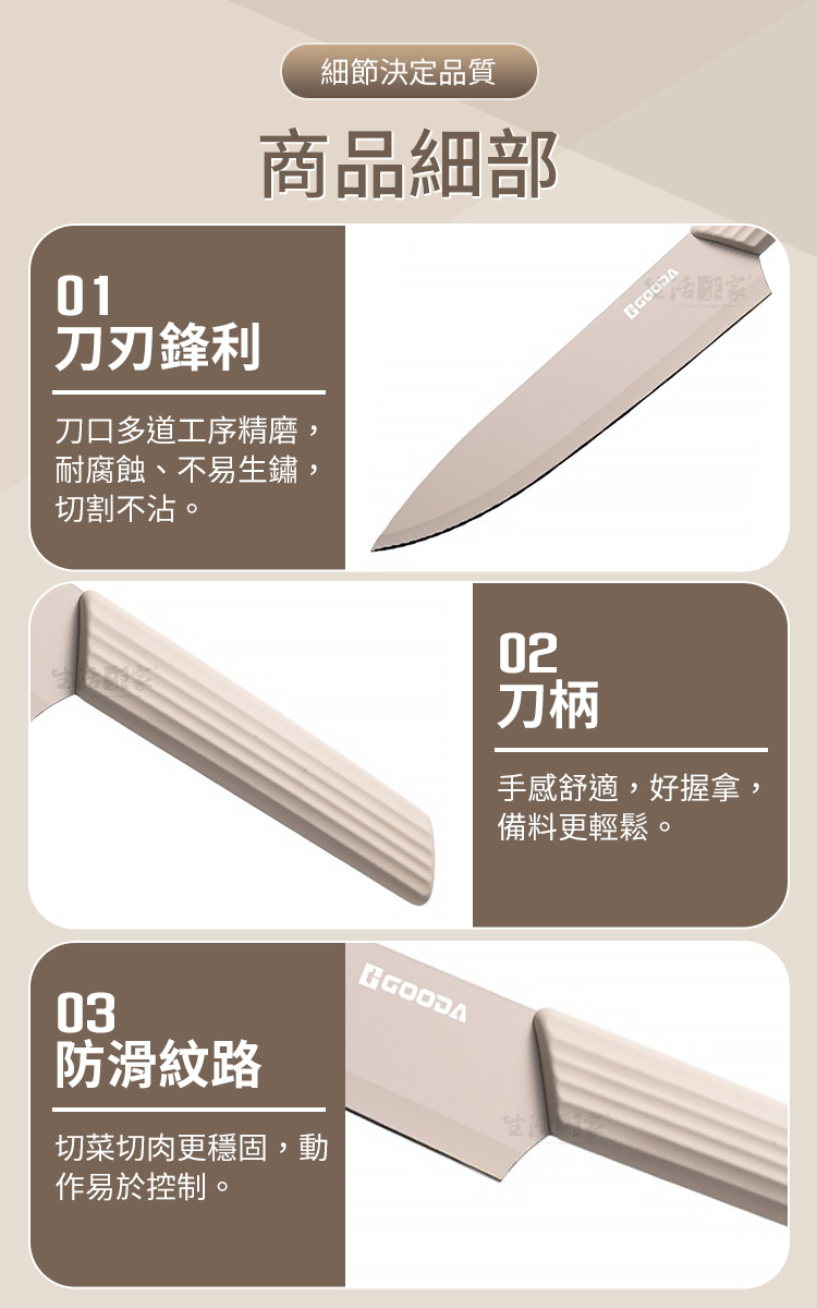 Q4:刀具有防滑設計嗎? A:有,刀柄採防滑紋路與人體工學設計,即使濕手操作也穩定安全。