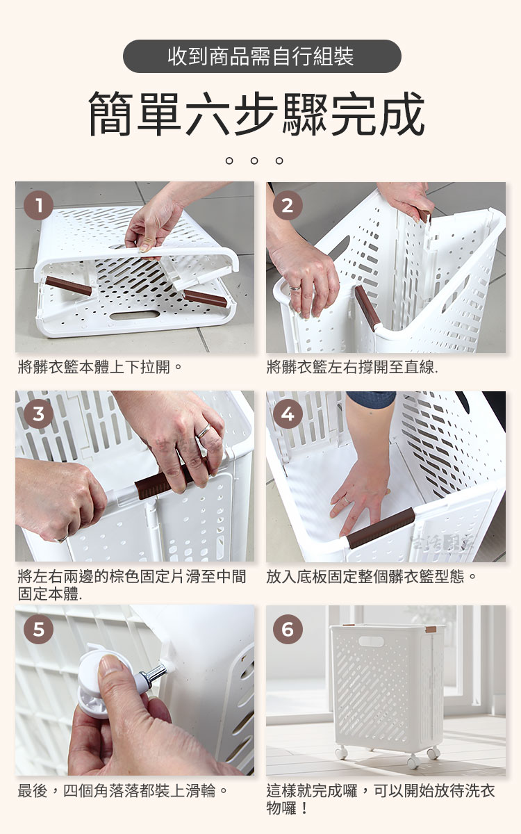 Q4:組裝會很困難嗎?需要準備螺絲起子嗎? A4:完全不需要工具!只需簡單的展開、固定側邊片、放入底板並扣上滑輪,簡單六步驟即可完成,長輩也能輕鬆操作。