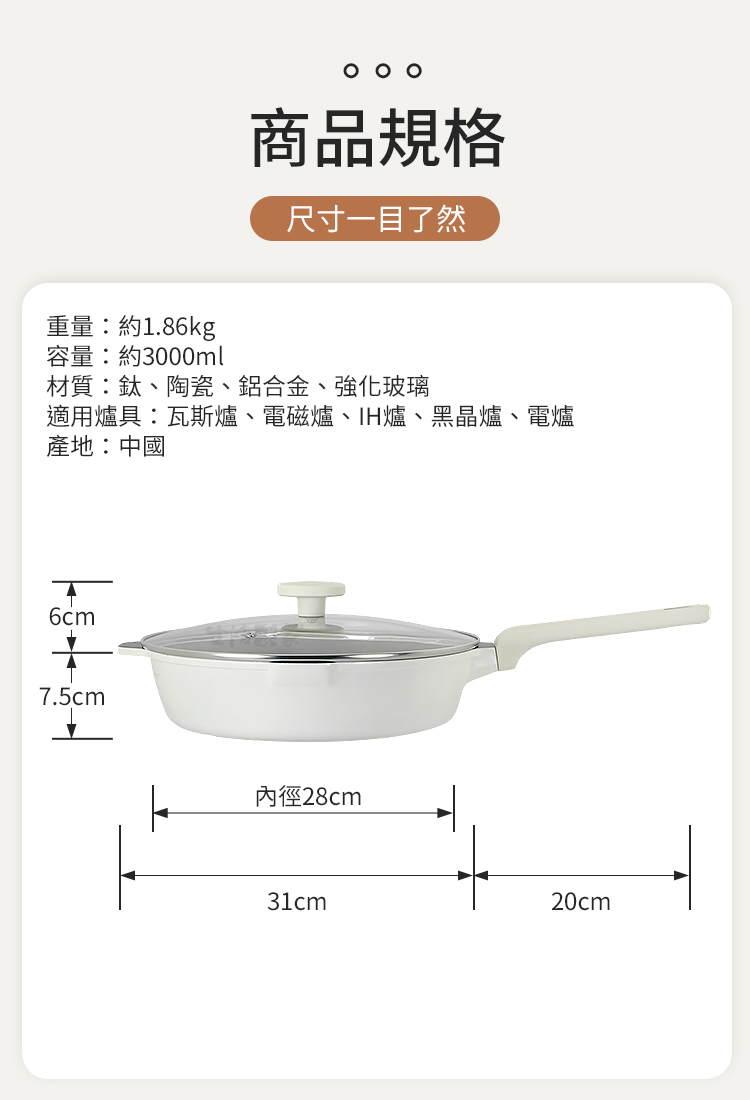Q4:為什麼建議選擇 28cm 這個尺寸? A4:28cm 是家庭料理的黃金尺寸,搭配 7.5cm 深型設計,容量足以應對 2-4 人份料理,實用性最高。