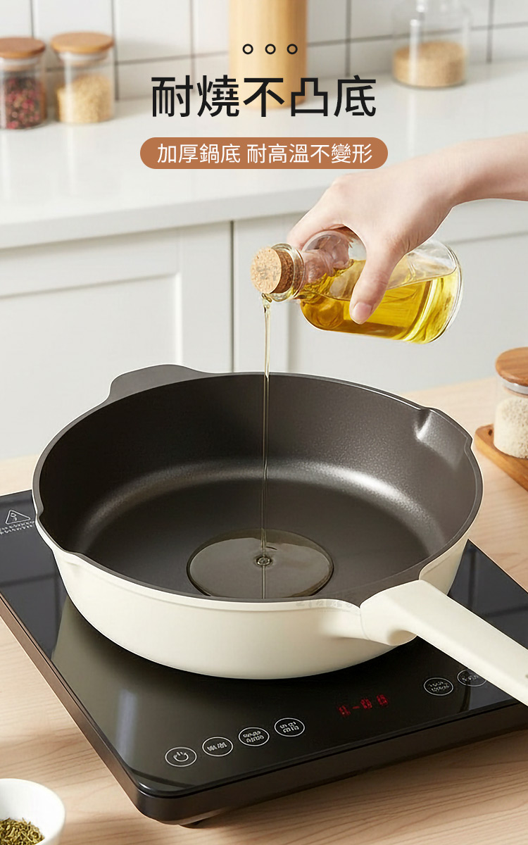 ✅ 導磁厚底設計 ⚡: 加厚底座抗熱不變形,油品能均勻鋪開不凸底,導熱迅速均勻,且能適用各種爐具,大幅縮短烹飪時間,鎖住食材鮮甜肉汁。
