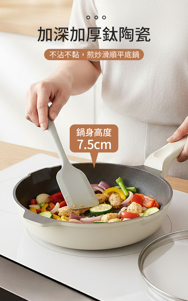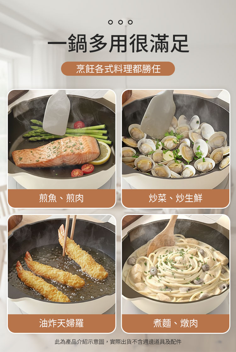 ✅ 7.5cm 加深鍋型 🍲: 比一般平底鍋更深!煎魚、炒菜不易噴濺至台面,甚至燉煮義大利麵、油炸天婦羅都能一鍋搞定。