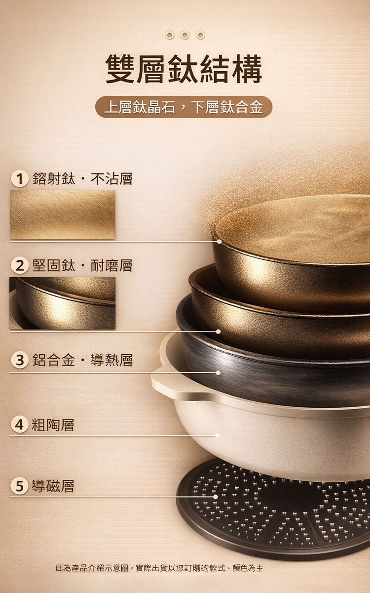 ✅ 五層複合鈦結構: 底層導磁、中二層導熱、上二層鈦晶陶鎔覆層,不僅不沾而且導熱均勻,更具備抗酸鹼、耐腐蝕的特性。