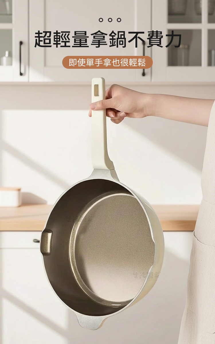 Q3:這款鍋子真的可以單手拿嗎? A3:是的。本產品針對使用者習慣進行輕量化設計,即使女性使用者或長輩也能輕鬆單手端鍋,但為了安全起見,移動過程中建議雙手端鍋。