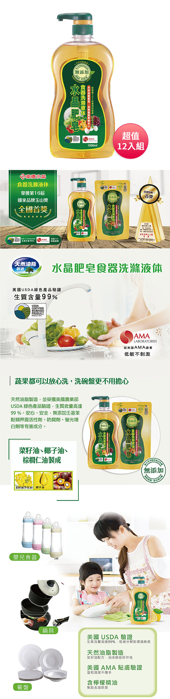 南僑 水晶肥皂食器洗滌液體1000ml超值家庭號12入組 台灣製 ■ 美國AMA低敏認證,溫和清潔不傷手 ■ 美國USDA綠色產品驗證,生質含量99% ■ 榮獲國家品牌玉山獎【全國首獎】&【最佳產品類】 ■ 蔬果都可以放心洗,洗碗盤更不用擔心 ■ 天然油脂製造,安心、安全,無添加壬基苯酚類界面活性劑、防腐劑、螢光增白劑等有害成分 ■ 菜籽油(芥花油)、椰子油、棕櫚仁油製成 ■ 含檸檬精油,幫助去油除臭 ■ 沾取少量即可產生綿密泡沫,用量省、好沖洗、不殘留 ■ 適合清洗嬰兒食器、鍋具、餐盤等 ※注意事項: *遠離兒童,避免誤食 *手部有傷口者,戴手套使用較佳 *食器洗滌液體是使用天然原料日光照射會有輕微變色是正常現象,不影響產品使用安全