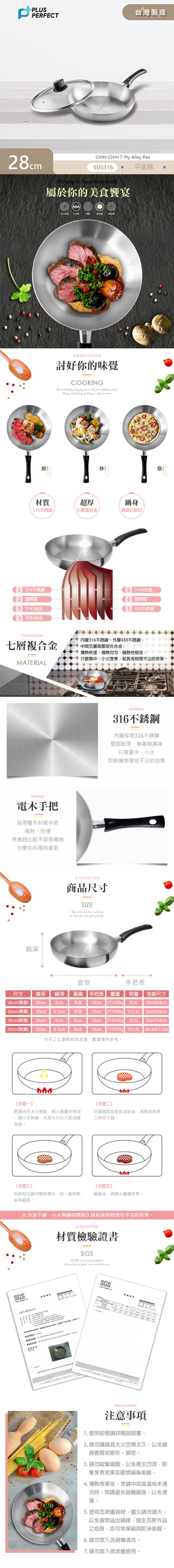 理想PERFECT 金緻316不鏽鋼七層平底鍋28cm(附蓋) KH_21328 台灣製 ■ 超厚七層複合金材質 ■ 內層採316不鏽鋼,堅固耐用 ■ 電木把手,能隔熱防燙 ■ 鍋身無鉚釘設計,不易藏汙納垢 ■ 只須中、小火即具物理性不沾的效果 ■ 適用紅外線爐、瓦斯爐、電爐、鹵素爐、電磁爐 ■ 台灣製造