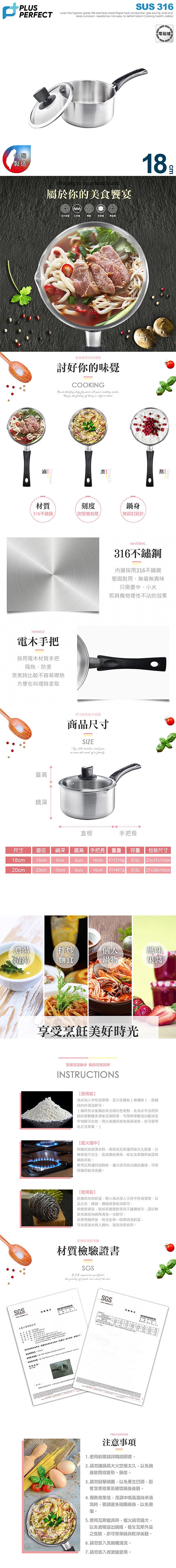 理想PERFECT 金緻316不鏽鋼湯鍋18cm(附蓋) KH_36818 台灣製 ■ 採最高等級316不鏽鋼,堅固耐用 ■ 超大口徑,可當湯鍋、雪平鍋使用 ■ 鍋身一體成型,無鉚釘設計 ■ 電木把手,能隔熱防燙 ■ 附玻璃鍋蓋,能隨時掌握烹調狀況 ■ 側邊倒流設計 ■ 適用紅外線爐、瓦斯爐、電爐、鹵素爐、電磁爐 ■ 台灣製造