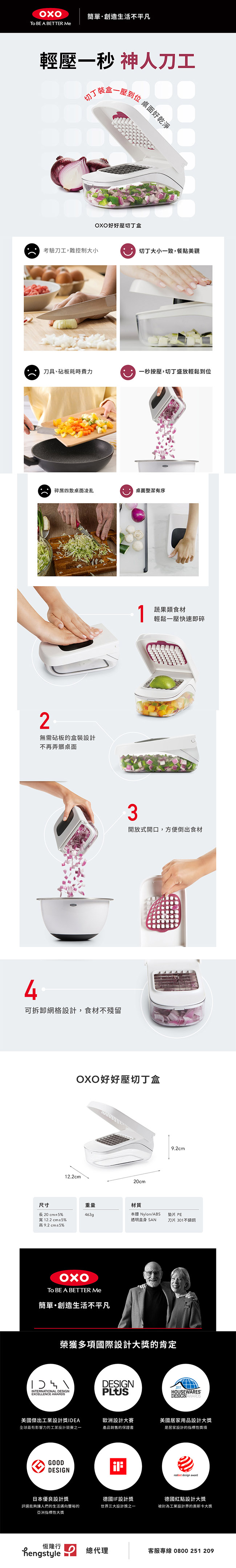 美國OXO 好好壓切丁盒/附帶容器與刀片(洗碗機適用) OX0101044A ■ 附帶容器與刀片,一壓即可快速切碎食材蔬果等食材。 ■ 切丁大小大約1.2CM*1.2CM ■ 盒裝設計無需砧板即可使用,不怕弄髒桌面。 ■ 開放式開口設計,方便倒出食材。 ■ 可拆卸網格設計,食材不殘留。 ■ 洗碗機適用 ※鑑賞期非試用期,本產品不開放試用,鑑賞期內如需退貨請保持商品全新狀態及原包裝,請勿拆封!
