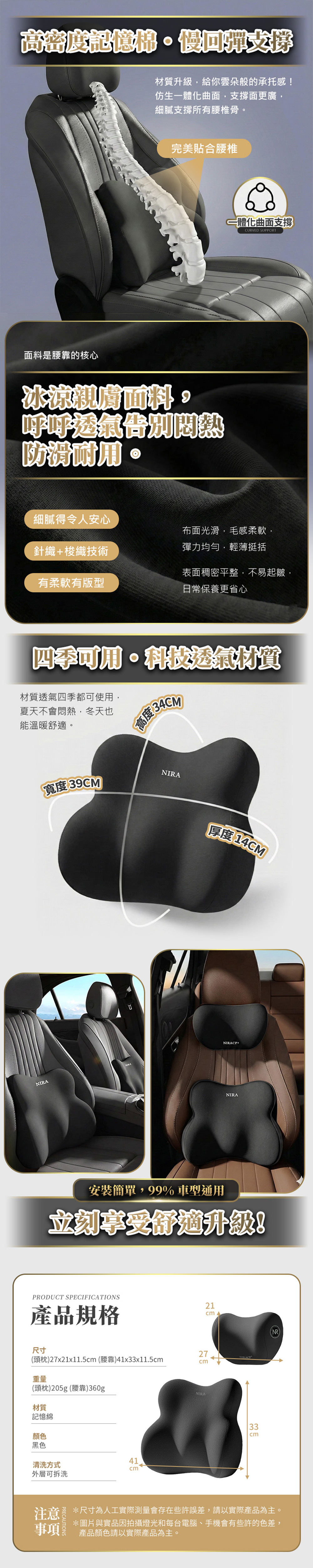 品名:雲感SPA級汽車頭枕腰靠|分區舒壓 人體工學 護腰靠墊| 型號:CP89 材質:記憶綿 顏色:黑色 尺寸: (頭枕)27x21x11.5cm (腰靠)41x33x11.5cm 重量: (頭枕)205g (腰靠)360g 清洗方式:外層可拆洗 包裝尺寸:44x35x32cm 包裝重量:595g 商品內容:腰靠x1/頭枕x1 商品內容:中國 本產品不提供試用,7天「鑑賞期」非「試用期」。欲辦理退貨之商品必須是全新完整、未拆封之包裝狀態(含商品本體、贈品、原包裝袋、盒、箱、隨貨文件)。除非是商品瑕疵問題,拆封後無法辦理退貨