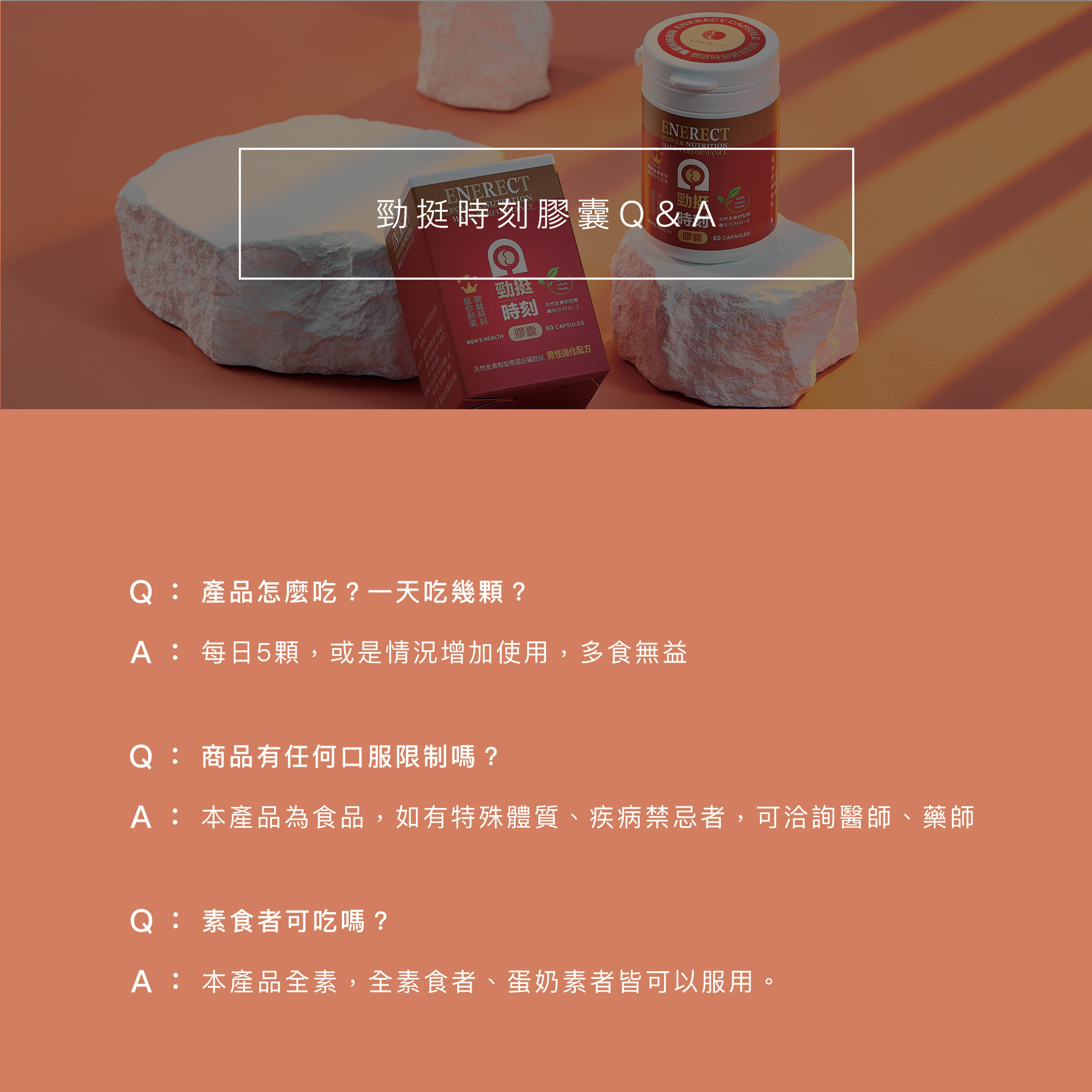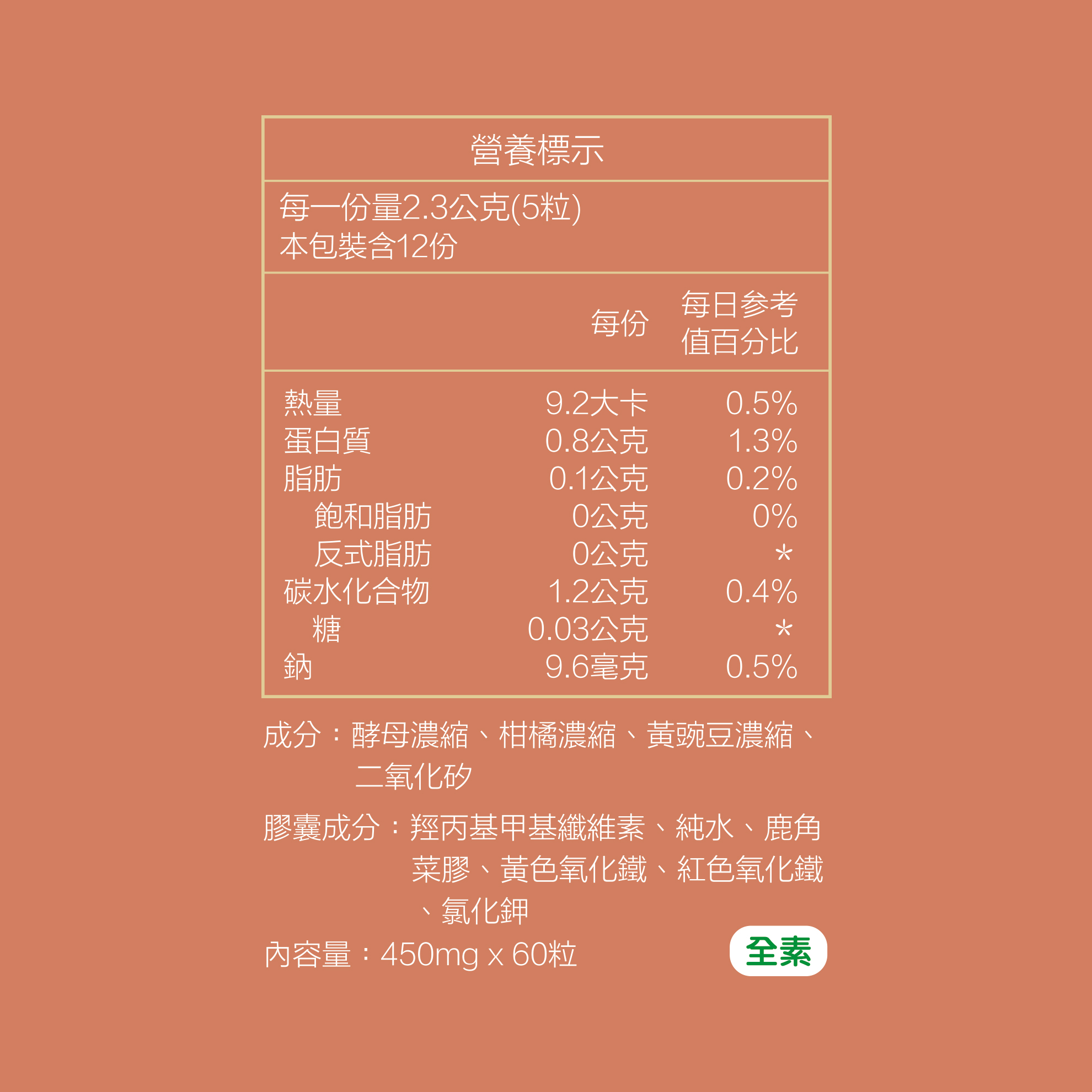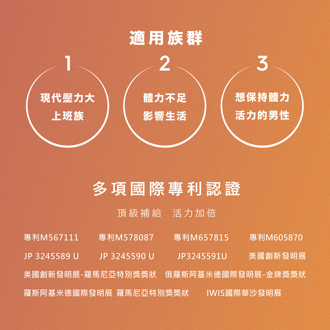 *品名:勁挺時刻 *容量:60粒/盒/450mg *主要成份:酵母濃縮、柑橘濃縮、黃豌豆濃縮、二氧化矽 *膠囊成分:羥丙基甲基纖維素、純水、鹿角菜膠、黃色氧化鐵、紅色氧化鐵、氯化鉀 *食品添加劑:無 *經銷商名稱:愛納奇國際有限公司 *經銷商地址:台北市中山區中山北路二段112號14樓 *經銷商電話:(02) 2700-6357 *食用方法:每日5顆,或視情況增加使用,多食無益。開封後請2個月內使用完畢,以保最佳品質。 *保存方法:請放置於乾燥陰涼處,避免陽光直射。 *注意事項:本品為食品,如有特殊體質、疾病禁忌者,請諮詢醫師、藥師。 *原產地:台灣 *保存期限:3年(未開封)(以消費者收受日起算,至少距有效日期前219日以上) *食品業者登錄字號:E-194267699-00000-4 *產品責任險字號:富邦產險0525-25AML0006316 ![]()