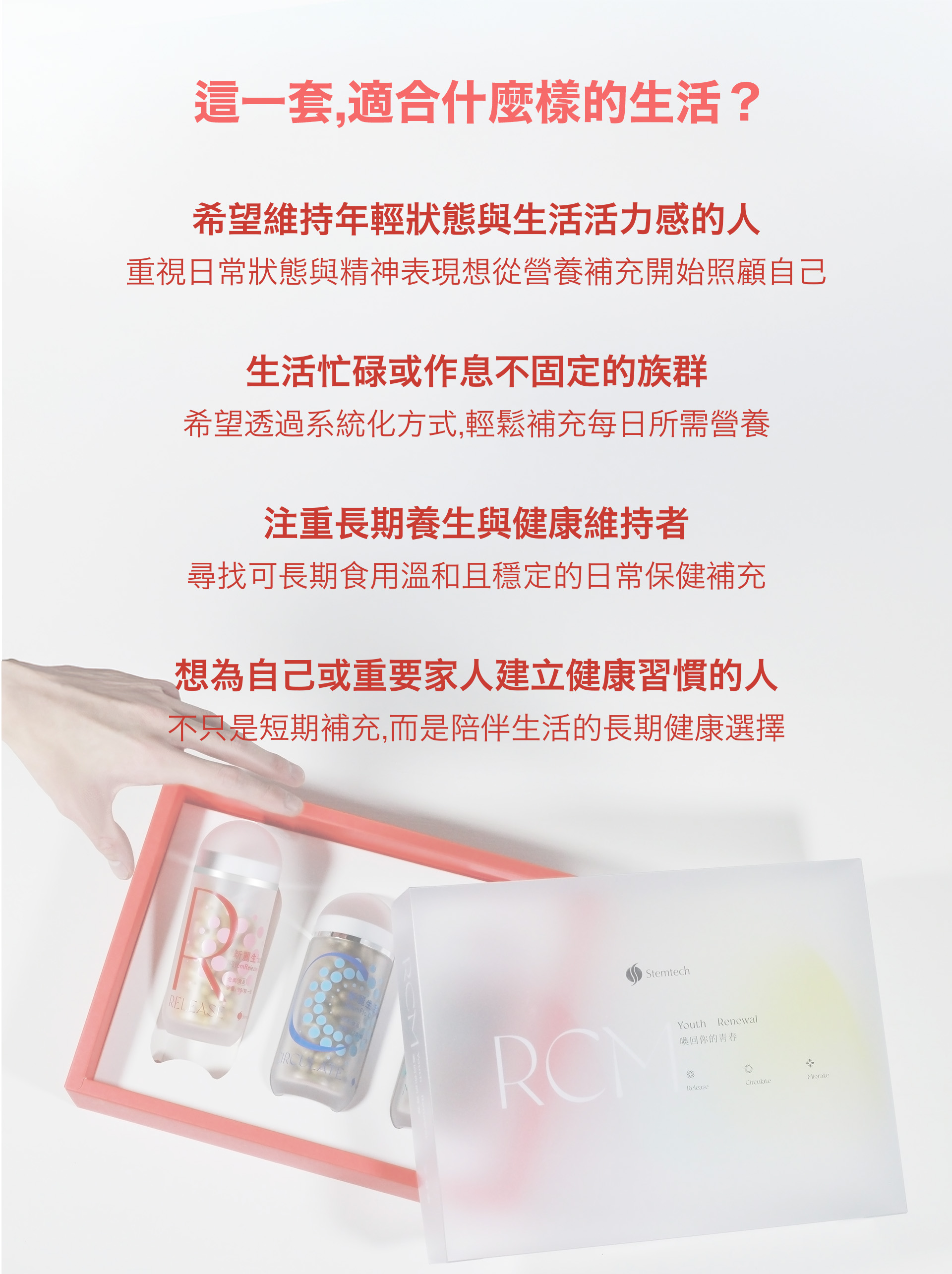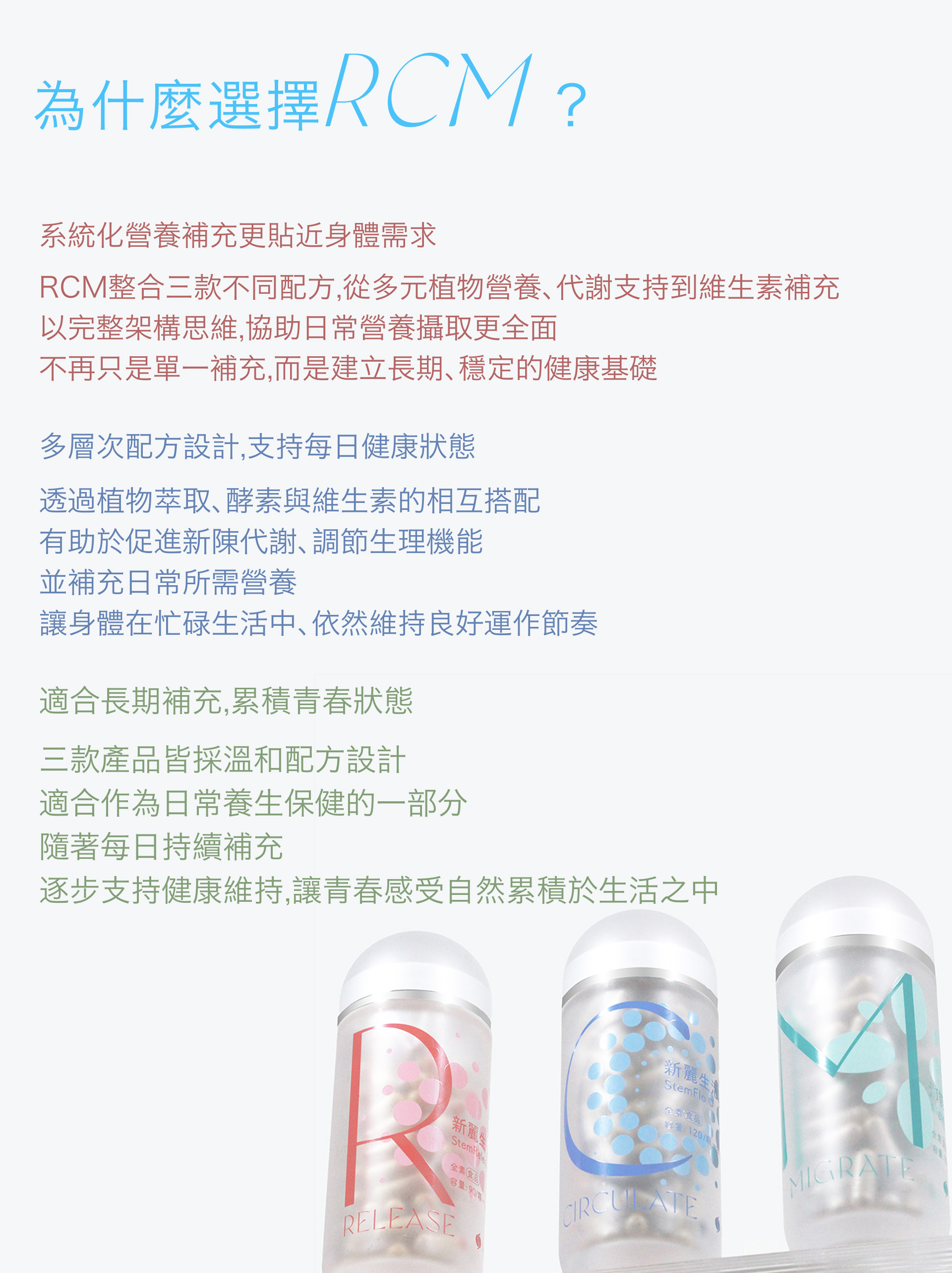 青春,不只是年齡,而是一種每天的狀態。 RCM 營養系統禮盒,將多元植物營養、代謝支持與維生素補充整合為一套完整方案, 從日常飲食之外,提供穩定且可長期的營養支持。 透過「釋放・循環・遷移」的系統思維, 協助身體在忙碌生活中維持良好運作節奏, 讓每一天的補充,不再零散,而是逐步累積, 陪你由內而外,找回屬於自己的青春感受。