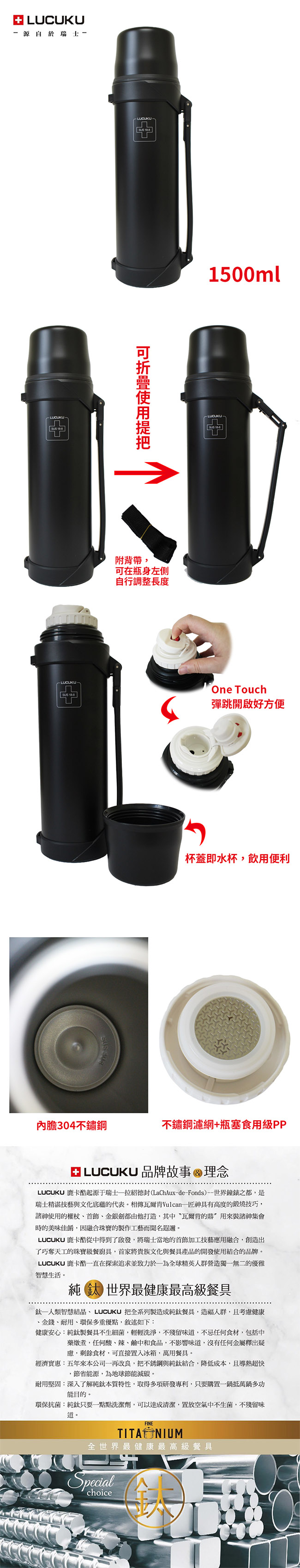 瑞士LUCUKU 304不鏽鋼冷暖隨心真空瓶1500ml FA-046 ■ 高雅流線型設計 ■ 新型開關,One Touch彈蓋好便利 ■ 內外杯使用方便 ■ 背袋設計外出便利 ■ 雙層真空設計,減少熱量流失 ■ 無毒PP材質穩定性強,冷熱皆好用 ■ 內膽採用304不鏽鋼,安全健康 ■ 瓶口外徑約6cm